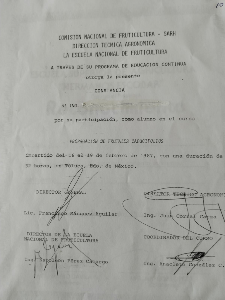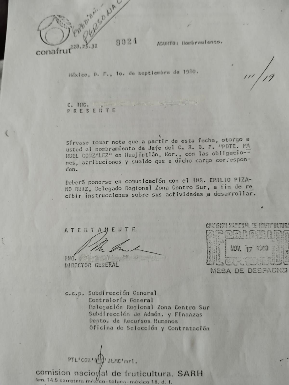 Con el fin del mandato del presidente Miguel de la Madrid y la ascensión de Carlos Salinas de Gortari a la presidencia —y de Antonio Riva Palacio a la gubernatura de Morelos—, llegaron vientos de cambio radical. El periodo del “primo” de López Portillo al frente de CONAFRUT concluyó, y le sucedieron una serie de directores: los ingenieros César Buenrostro, Javier Díaz de la Vega y Francisco Márquez Aguilar (Anexo 8, Anexo 9, Anexo 10). Bajo su gestión, se fortalecieron los programas de capacitación en instituciones como la Universidad Autónoma de Chapingo, la UAM, la Escuela Superior de La Laguna y la UAEM (Anexo 11, Anexo 12), y se donó planta al estado de Guerrero (Anexo 13).
